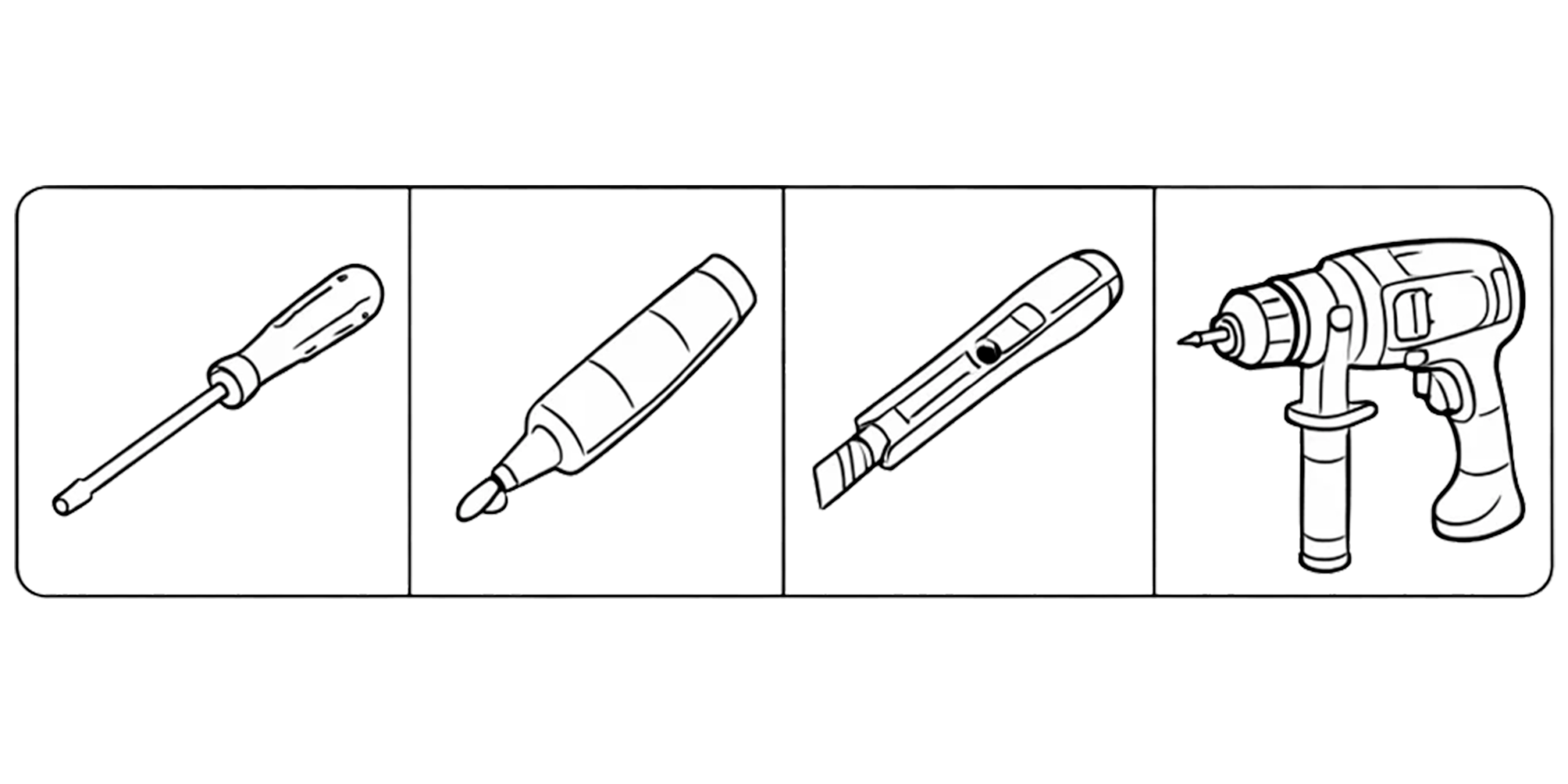 Подготовьте всё необходимое оборудование заранее, чтобы процесс сборки прошел быстро, точно и в полном соответствии с вашим планом. Вам потребуется: канцелярский нож, отвертка, гаечный ключ на 6, герметик, перфоратор, молоток.