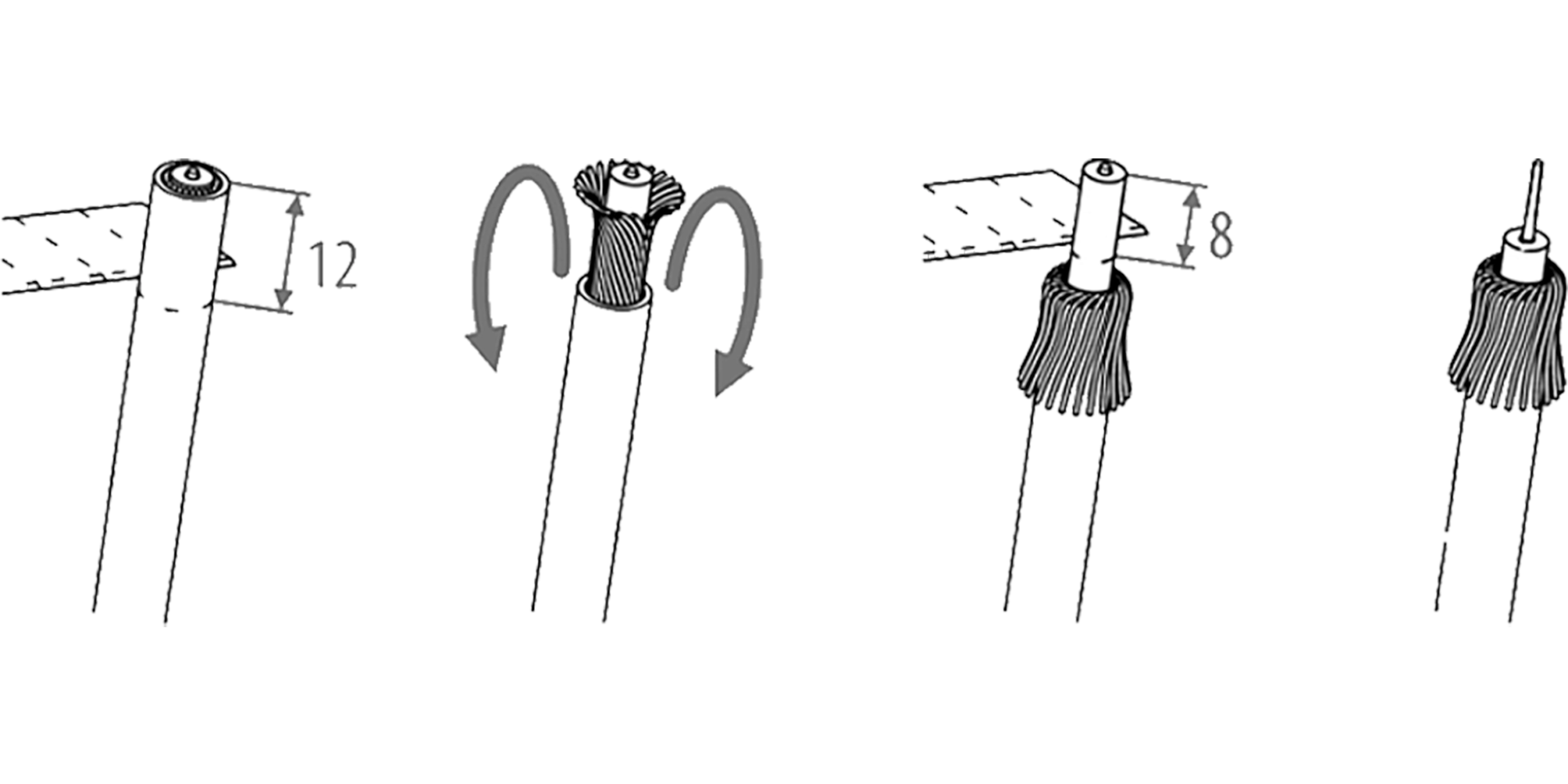 Освободите центральную жилу и экран от оплетки ровными слоями, создавая надежную основу для стабильного и чистого видеосигнала.
